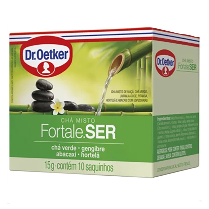 Chá verde Dr. Oetker com gengibre, hortelã e abacaxi, refrescante e aromático, perfeito para momentos de bem-estar.